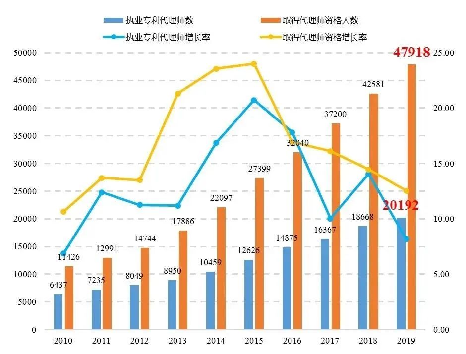随着我国专利申请量和专利代理业务需求的快速增长,专利代理人才队伍也在不断壮大,截至2019年底,我国执业专利代理师数量已达2.0192万人(不含港澳台地区)。
